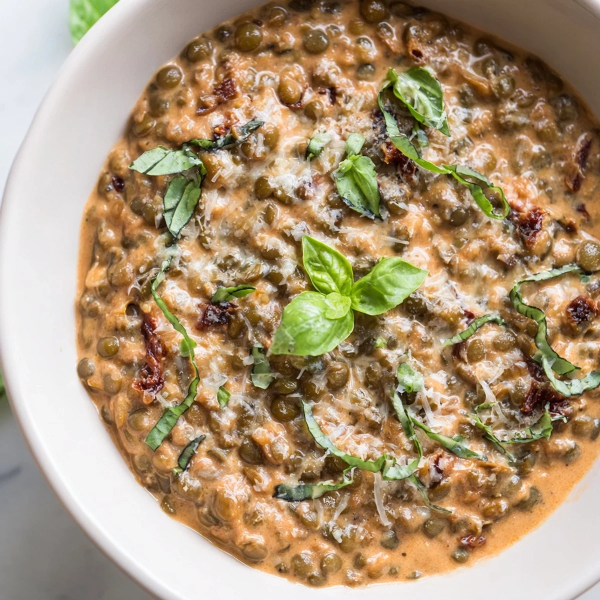These creamy Mediterranean lentils feature a rich sauce made with sun-dried tomatoes, heavy cream, and Parmesan. The dish comes together in under an hour and delivers deep, savory flavors from aromatic herbs like oregano, thyme, and smoked paprika. Perfect served with crusty bread or alongside roasted vegetables for a complete meal.